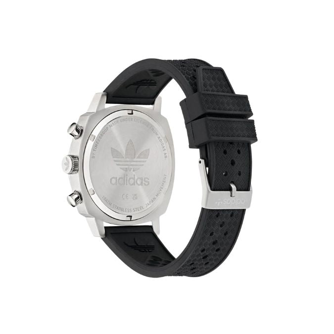 A modern take on a vintage silhouette, the Edition One Chrono watch draws inspiration from speed sports, featuring chronograph functions and a tachymetric scale on the bezel capable of measuring speeds up to 400 units per hour. The second hand adds a distinctive touch with its adidas Originals blue color.