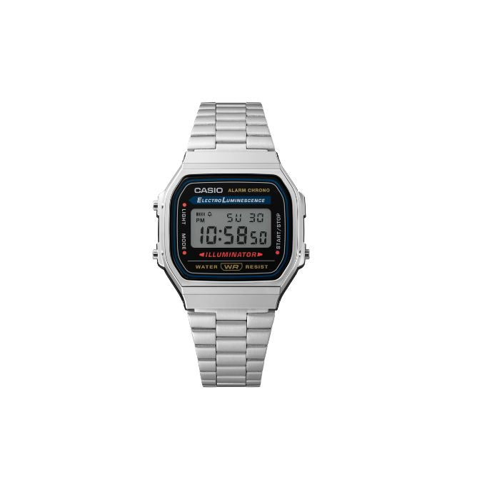The A168WA-1W is a classic digital watch from Casio known for its retro design and reliable functionality. It features a stainless steel band and a square-shaped case in a silver-tone finish, giving it a sleek and timeless look. The watch has a digital display that shows the time, day, and date, making it easy to keep track of important information. It also includes features such as an alarm, stopwatch, and automatic calendar, providing convenience for everyday use.