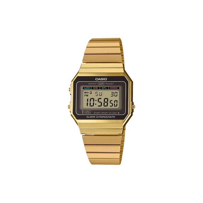 The Vintage digital Rectangle watch is a sleek and functional digital watch from Casio, known for its durable design and practical features. It features a stainless steel band and a square-shaped case with a black dial, giving it a modern and versatile look. The watch has a digital display that shows the time, day, and date, making it easy to keep track of important information. It also includes features such as an alarm, stopwatch, and automatic calendar, providing convenience for everyday use.