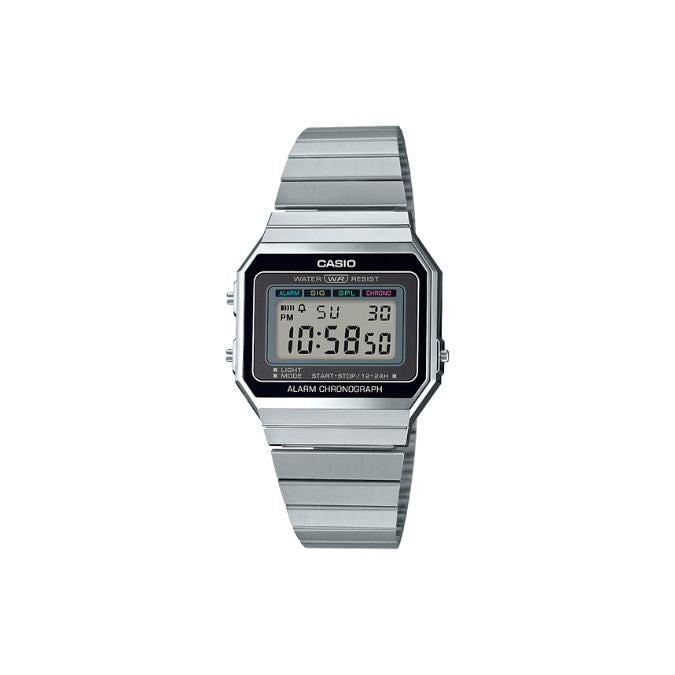 The Vintage digital Rectangle watch is a sleek and functional digital watch from Casio, known for its durable design and practical features. It features a stainless steel band and a square-shaped case with a black dial, giving it a modern and versatile look. The watch has a digital display that shows the time, day, and date, making it easy to keep track of important information. It also includes features such as an alarm, stopwatch, and automatic calendar, providing convenience for everyday use.