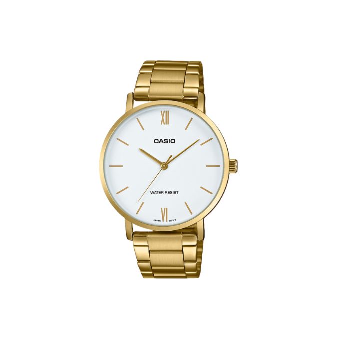 The watch is a sleek and stylish analog watch that combines modern design with a touch of elegance. It features a gold stainless steel band and an elegant white dial with a minimalist design.