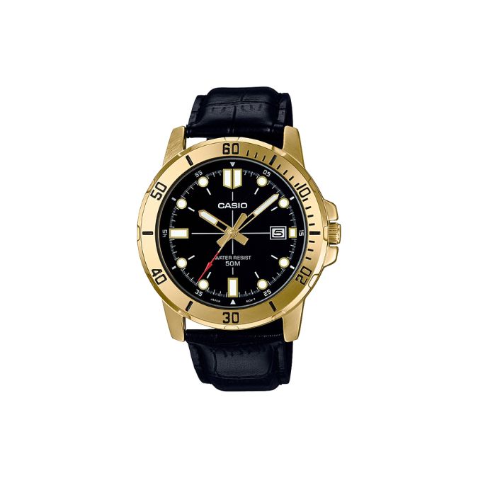 The Casio Diver watch with a leather strap is a stylish and elegant analog watch that blends classic design elements with modern functionality.