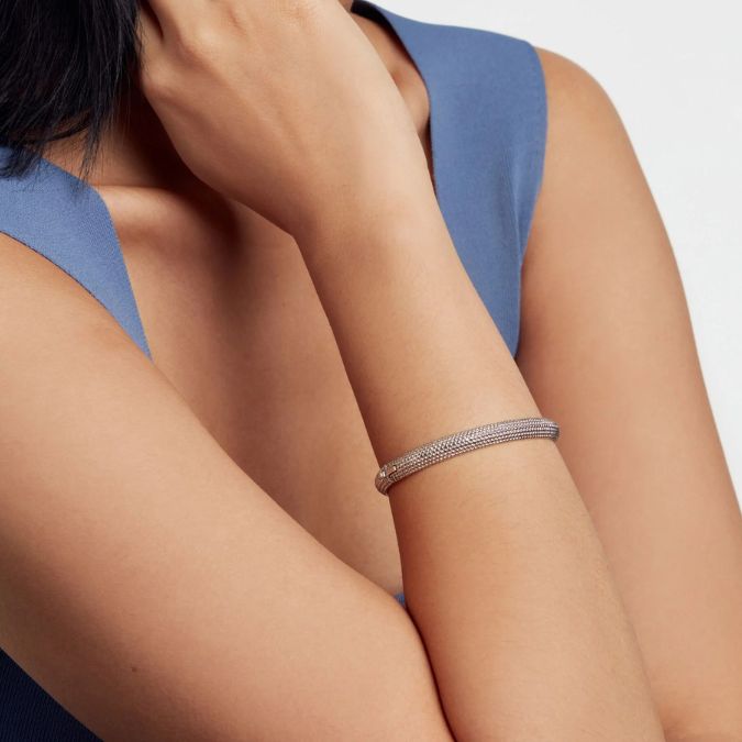 A contemporary take on a classic, try the DOTETT bangle bracelet. The dotted texture design complete in silver-tone plating creates depth and shine for a piece that will stand out in your jewellery box. An easy-to-use discreet hinge closure gives it a secure fit.