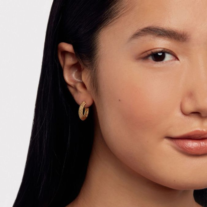 A contemporary take on a classic, try the Dotetta hoop earrings. The dotted texture design complete in gold-tone plating creates depth and shine for a piece that will stand out in your jewellery box, and yet is still wearable with every look.