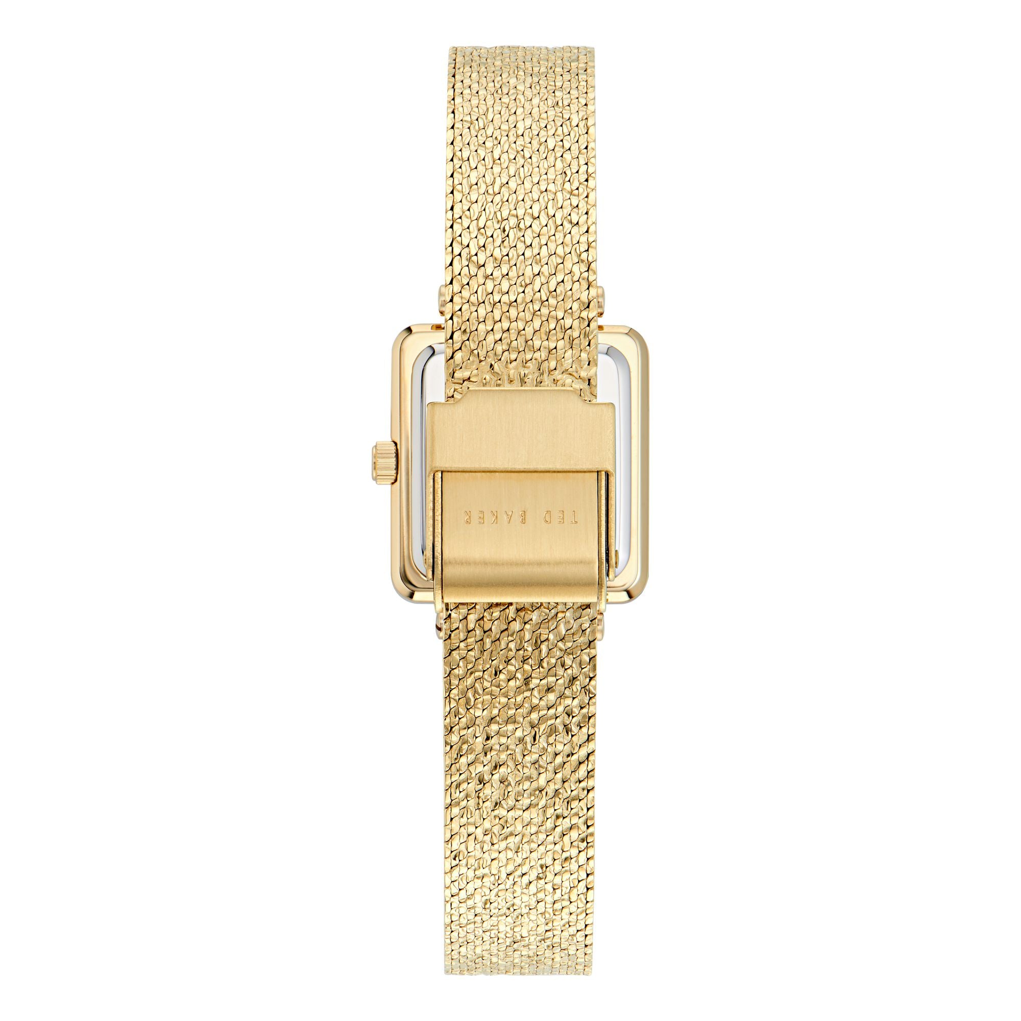Ted Baker's Mayse watch features a sleek rectangular dial paired with a mesh band. The striking emerald green dial adds a vibrant touch, making this timepiece truly stand out.