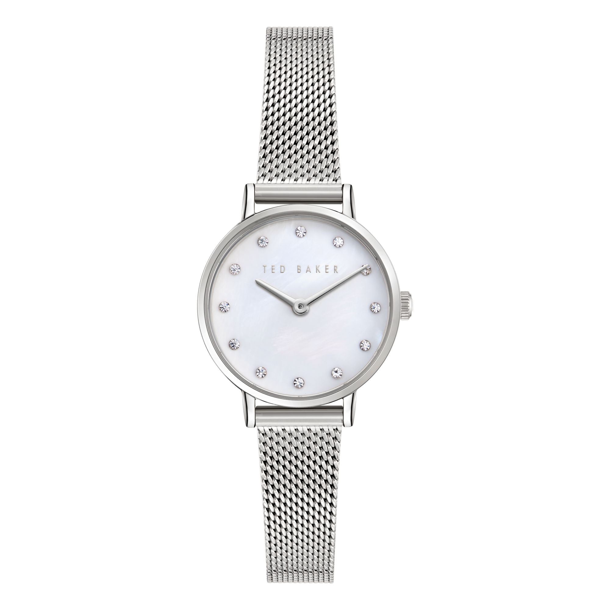 Ted Baker's Staciie watch showcases a charming smaller dial paired with a mesh strap. Delicately accented with subtle Swarovski stones, this timepiece exudes elegance.