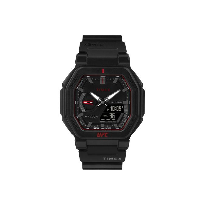 The Timex UFC Colossus comes equipped with the indestructible design and core timing features that fighters and fans need to compete at the highest level. It's custom analog-digital functionality includes a world time feature, alarm, calendar, and chronograph that level up its traditional mode of timekeeping. Decked out in a bold black and Red-tone color scheme, this watch is tough at all times thanks to the rugged case design with ISO shock-resistant construction for lasting durability. Luminous hands for night visibility teams up with our revolutionary INDIGLO® backlight technology, so you can finish the challenge, no matter the conditions.