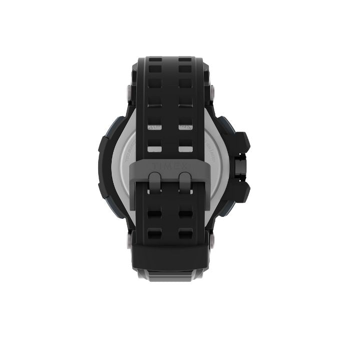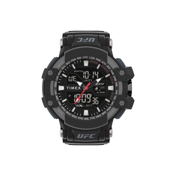 The TIMEX UFC Combat is an analogue-digital powerhouse expertly engineered to keep up with you. Its features 24-hour chronograph with 1/100-second resolution, 24-hour military time, dual time zones, calendar, and daily alarm/alert system. Construction-wise, this watch is as tough as they come thanks to the rugged 53mm black case design, scratch-resistant lens, and black resin straps for lasting durability. Bold and tough our revolutionary INDIGLO.