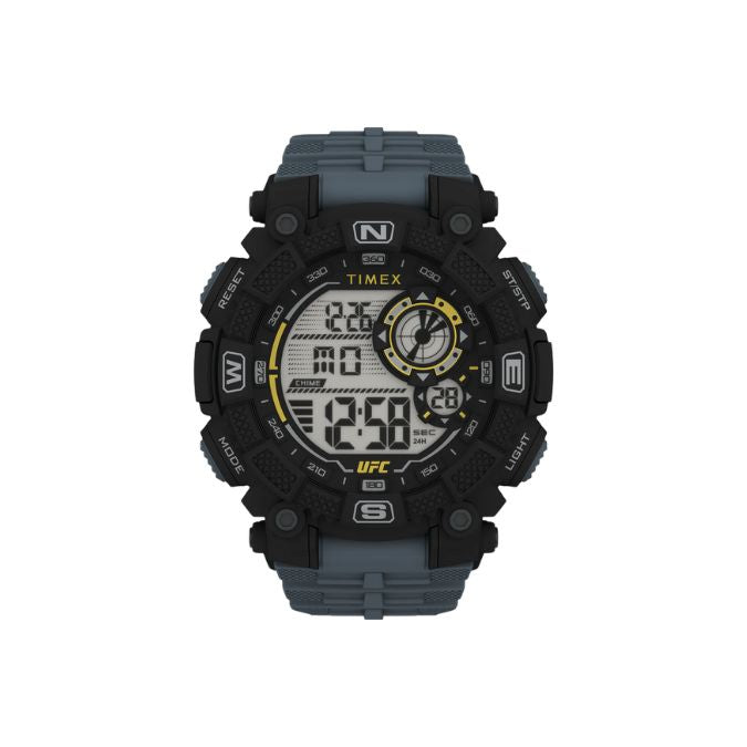 Deceivingly lightweight despite its hardy exterior, the iconic five-button design of the Timex UFC Redemption gives you direct access to a 100-hour chronograph, 24-hour countdown timer, military time, dual time zones, alarm, and our revolutionary INDIGLO® backlight. It’s sealed for water resistance up to 50m and equipped with a compass bezel and gray molded resin straps for lasting durability. The textured tactile design of its pushers and substantial black 50mm case profile are immensely practical features if you’re in the middle of training—simply reach down, feel for the pusher, and finish the challenge without interruption.
